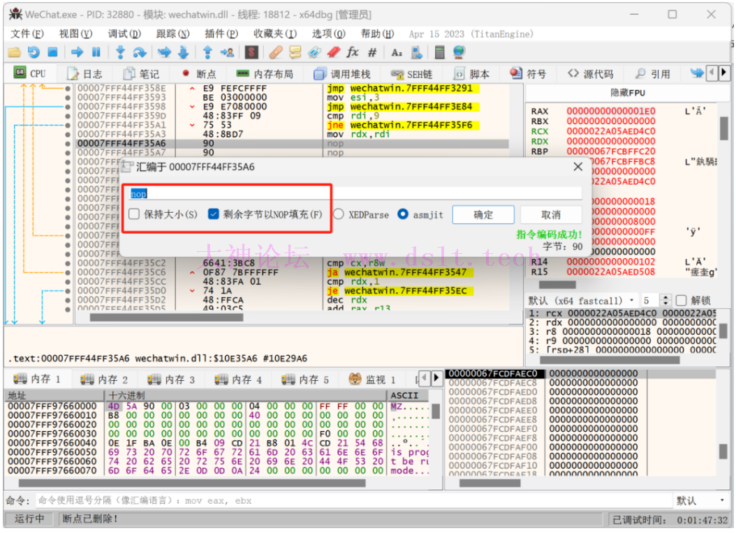 步骤七:重新给目标微信发送消息,并撤回。在断点处修改汇编,填充NOP空字节。