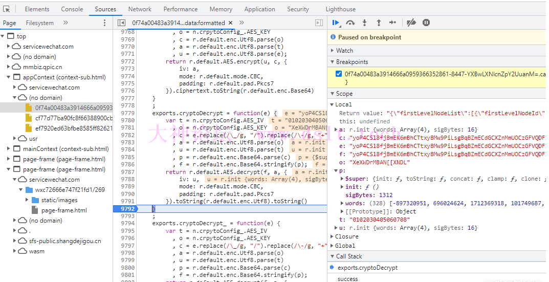 二、结束 CryptoJS 是一个三方的JS库。写一段代码证明一下。 function cryptoDecrypt_(e) { var t = n.crpytoConfig.AES_IV , o = n.crpytoConfig.AES_KEY , c = e.replace(/\_/g, "/").replace(/\-/g, "+") , a = CryptoJS.enc.Utf8.parse(o) , u = CryptoJS.enc.Utf8.parse(t) , p = CryptoJS.enc.Base64.parse(c) , f = CryptoJS.enc.Base64.stringify(p); return CryptoJS.AES.decrypt(f, a, { iv: u, mode: CryptoJS.mode.CBC, padding: CryptoJS.pad.Pkcs7 }).toString(CryptoJS.enc.Utf8).toString() } console.log(cryptoDecrypt_(str));