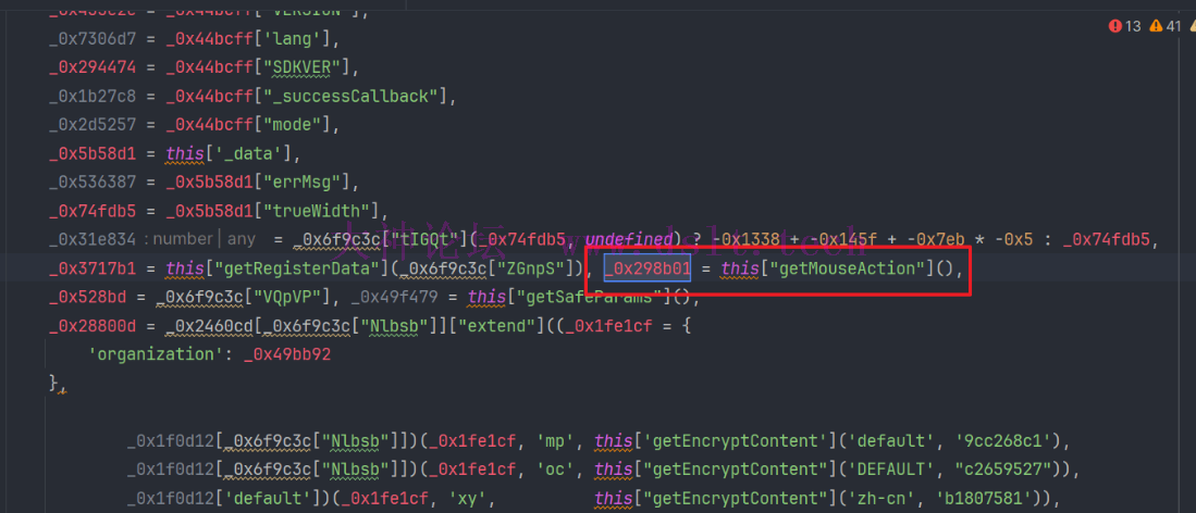 通过处理过的JS代码可以找到来源,_0x298b01来自于this["getMouseAction"]()的函数结果。通过函数名字getMouseAction大概可以猜到这个对象的数据应该是记录的一些鼠标的坐标信息。