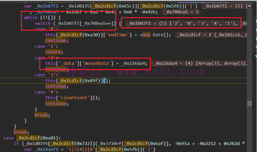 定位到这个位置发现,this['_data']['mouseData']被_0x226da4赋值了,所以我们继续跟踪_0x226da4的值。 正常来说switch case分支里面的代码不会被依次执行,但是这个函数不太一样,外面套了一层while循环,然后在switch的变量是一个数组,里面的值是2,0,3,4,1,所以这个switch分支会按照20341的顺序去执行。
